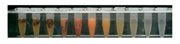 Figura 3. A concentração de NaOCl diminui de 6,0% (tubo 9) a 0,023% (a partir de tubo 9 à esquerda) e os tubos com NaOCl a 6% e CHX a 2%, respectivamente.
