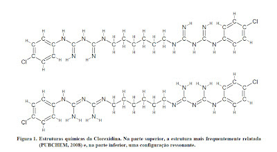 A CHX é um sal cujo íon positivo é a clorexidina "C22H30Cl2N10" com massa molecular de 505,4460 g/mol, massa monoisotópica de 504,2032 Da (Dalton) e número de registro CAS "55-56-1". (Yeung et al., 2007; Wishart et al 2007; Pubchem, 2008). A estrutura química da CHX pode ser ilustrada na Figura 1.