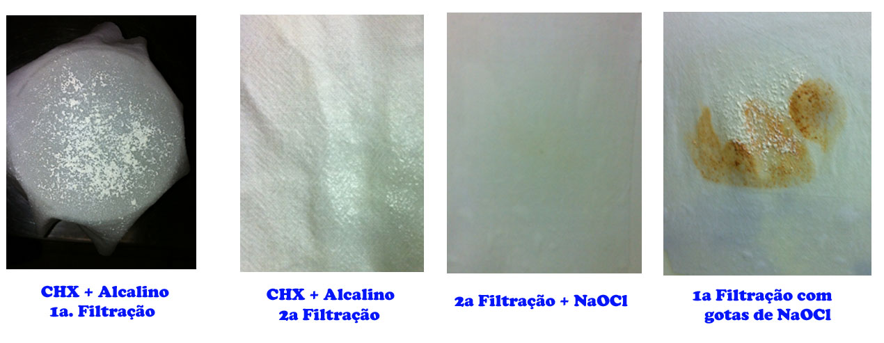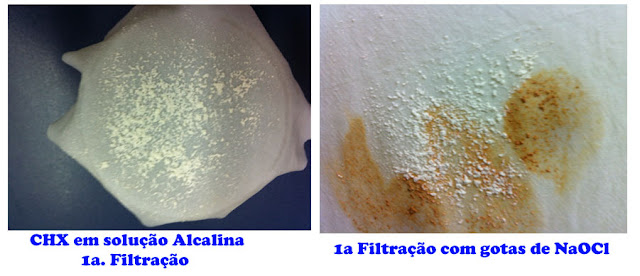 Na 2ª filtração, (2ª amostra), com a solução sem os precipitados, é adicionado NaOCl a 10% 3ª amostra). A reação que ocorre no tecido é quase imperceptível. A coloração (âmbar) característica (CHX + NaOCl) aparece quando o NaOCl é adicionado diretamente sobre os precipitados conforme mostra a sequência da Figura 8 a seguir: