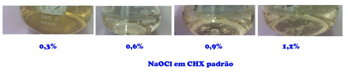 A mudança de cor ocorreu em todos os tubos onde a CHX foi adicionada, incluindo o tubo com concentração mais baixa de NaOCl 0,023%. A cor variou e não se alterou com o tempo. A mais baixa concentração de NaOCl a induzir um precipitado foi de 0,19% (tubo 4). Com a alteração da cor, o precipitado ocorreu imediatamente e não mostrou nenhuma mudança com o tempo.