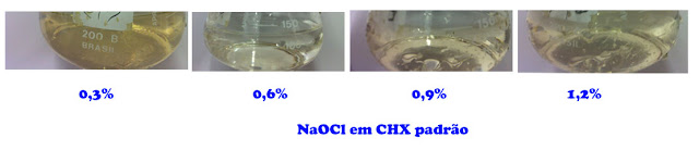 As soluções atendem ao trabalho de Barsani (2007): CHX padrão a 2% v/v; NaOCl a 6% p/v e Manzur (2007): NaOH 10% e água destilada.